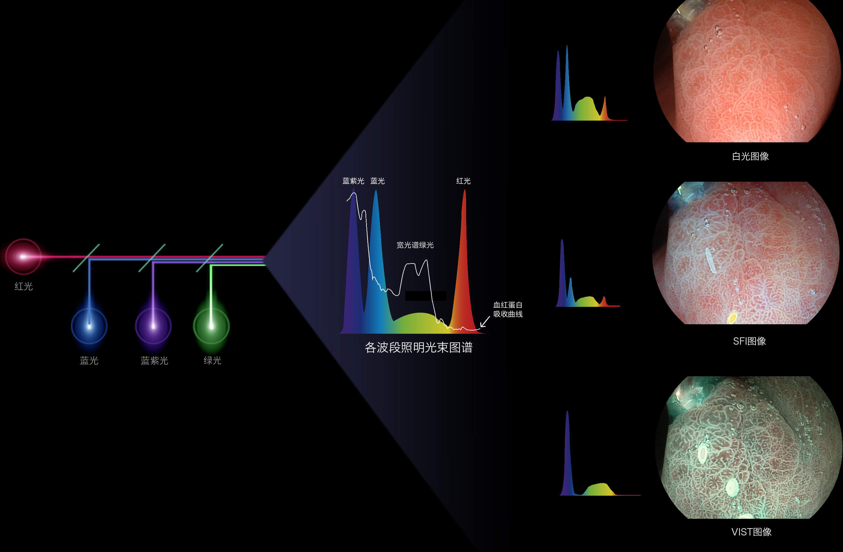 哈哈体育官网新开发的内镜染色技术,主要是基于多波长LED 光源的开发,VLS-55Q 四波长LED 光源是由四个不同颜色的LED光按照相应照明模式所规定的特定发光比例进行合束后形成,合束后形成的照明光的光谱由红光、绿光、蓝光及蓝紫光这四个不同的波段范围构成。具有更高光谱自由度,通过光谱比例的控制,实现了聚谱成像技术,英文全称为“Spectral Focused Imaging, SFI”,缩写为“SFI”和光电复合染色成像技术,英文全称为“Versatile Intelligent Staining Technology, VIST”,缩写为“VIST”。